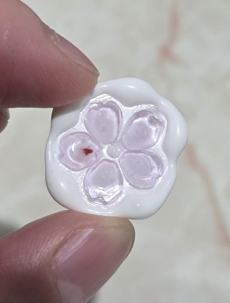 而下圖這個櫻花印章的材質是較新的果凍蠟,呈現半透明的效果。不過它的缺點就是不太能黏到底部的蠟中,比平常的蠟容易掉出來︰