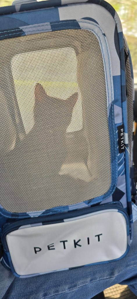 寵物袋內像剪影般的就是我家的虎斑貓柏柏B (Chopper)。