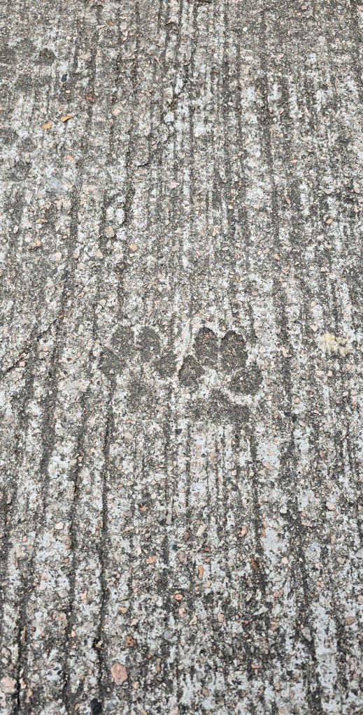想想也是合理的,工地總會養唐狗負責守護或是其他目的(不是宰來吃就好)。就算不是故意帶狗狗來,小動物不會有意識繞過鋪好的路,就直直的走過去,留下小腳印是理所當然的。