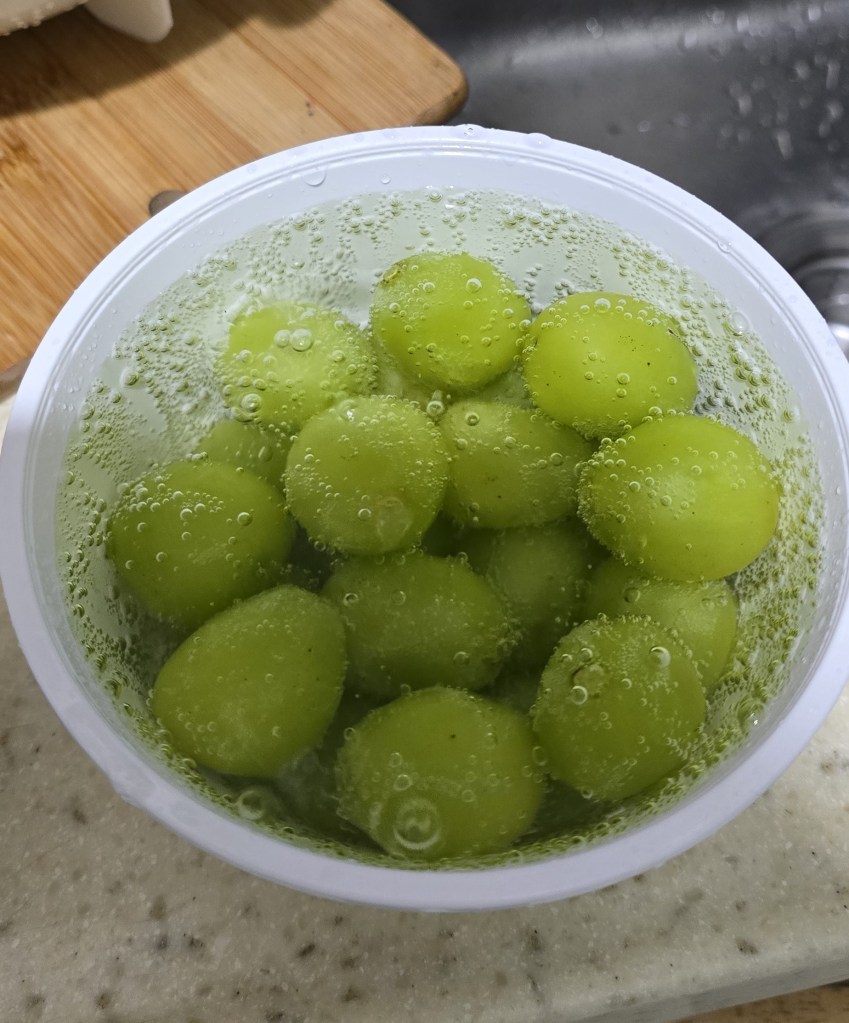 這是老公在網上看到的方法,聽說入口感覺很奇妙,一邊吃提子一邊有氣泡在口腔爆開,那就試試看吧。
